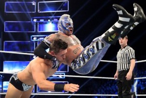 These two can fight. It’s a little slow paced but all together a good fight. A lot of back and forth. A few pin attempts by the Miz can’t get more than a 2 count. What just happened. I looked away and Rey won. What the heck? Randy Orton comes out of know where to attempt the RKO on Rey, he misses and gets The Miz instead.