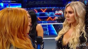 WOAH Becky’s Face is tore up and Ronda didn’t even do that to her! Paige is calling out all the ladies from the back. I love seeing all these women making their way to the ring. Naomi is my inner child, and hope Becky chooses her. Becky. Ales her way out to the ring to choose her replacement for Sunday. I was really looking forward to This match. I think she’s going to chose Charlotte, and boom I was right. She chose Charlotte, gives her a big hug whispers something in her ear. Does this mean they are friends again?